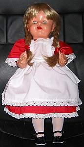 A broderie anglaise trimmed simple red cotton dress shows off the doll's blonde hair. To change the look of the outfit she has a white apron.